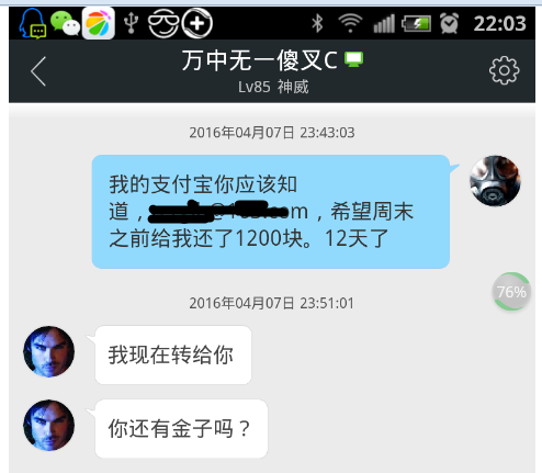 4月7号,晚上我睡觉前给他又说一遍支付宝,其实他知道我的支付宝毕竟以前交易过,而且都加的有好友。但是神奇的是情发生了23:43我特意重复了一遍我的支付宝,下线睡觉。23:51我下线以后他回复我要还钱了(这些截图都是手机助手上的,所以我虽然不在线第二天也能看到),但是结果还是没还,而且还有借口了,如图”那天我叫你,我有,现在没有怎么解决“。你妹啊,你还钱转给我不就行了,7分钟前刚发了支付宝,他告诉我他不知道支付宝所以没法转。