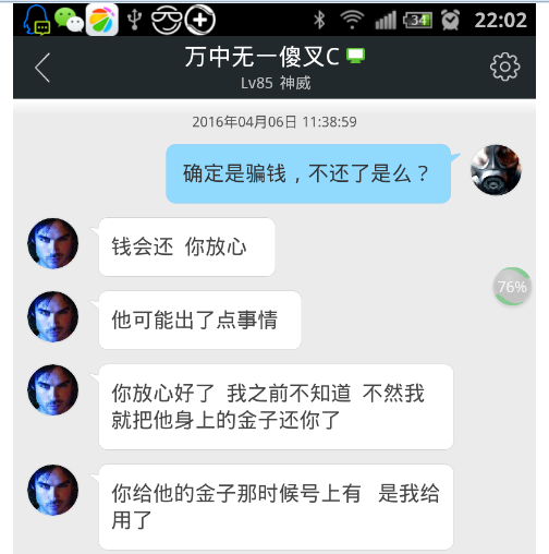 3月26号没还,等到28号。看图,有钱,但是现在不还,等到晚上还,当然结果就是晚上也没还。然后29号开始就一直不是本人了,号全天在线,也在收金也在涨功力但就不是本人。