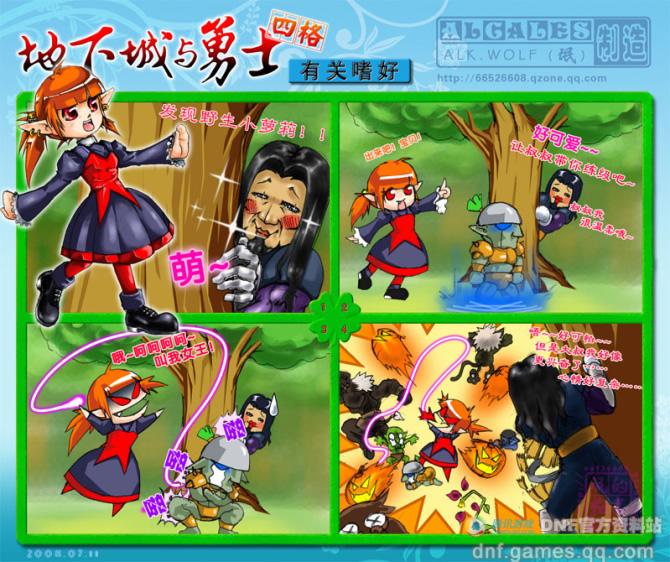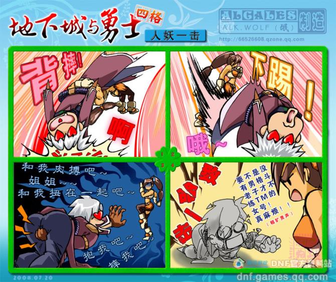 漫画旋风来袭 玩家爆笑四格 2008-08-07 12:48 新浪游戏 0 大家一定对地下城与勇士选择职业后,进入游戏前的开场漫画印象深刻。很好很强大的DNF玩家们也毫不示弱,搞笑天才“氓”,就给大家带来了他原创的DNF爆笑四格漫画。 是不是很有才呢?其实做搞笑漫画并不难,地下城与勇士官方资料站暑期特别活动“寻找DNF达人”之“漫画创意台词”即将开场。 8月7日起连续5周,我们每期推出一个台词为空的漫画模板,所有的故事对白均由你一手打造! 除了让你过一把当编剧的瘾,还有DNF抱枕、T恤、Q点等奖励哦!