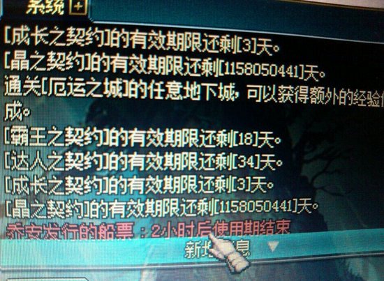 DNF刷晶体契约可用到人类灭亡 2014-12-04 14:33 新浪游戏 0 DNF国服发现新BUG,晶体契约可用到人类灭亡。算了算,最多的契约能用371W年,那时还有毒奶粉么……最近DNF国服BUG频发,著名DNF编辑小月月在群里吐槽:今年国服出现的bug手拉手可围绕地球一圈,看来此言是有这一定依据的。 下面有图:图1图2