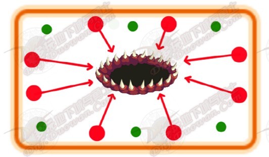 被嘴巴或地刺摸到的玩家受到极大伤害。持续模式4时玩家移动被吸附至地图中间。