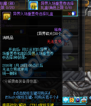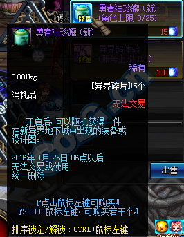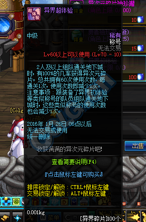 DNF体验服在活动期间异界抗魔值全面降低(普通5,冒险55,勇士70),在异界频道的勇者装备分解机分解异界装备可获得异界碎片,可兑换各种物品
