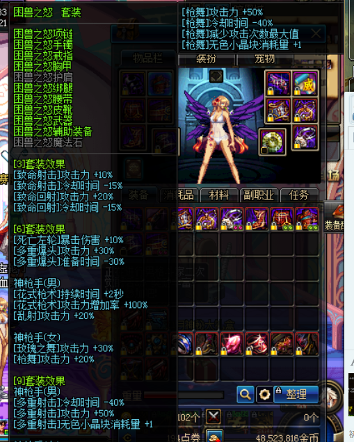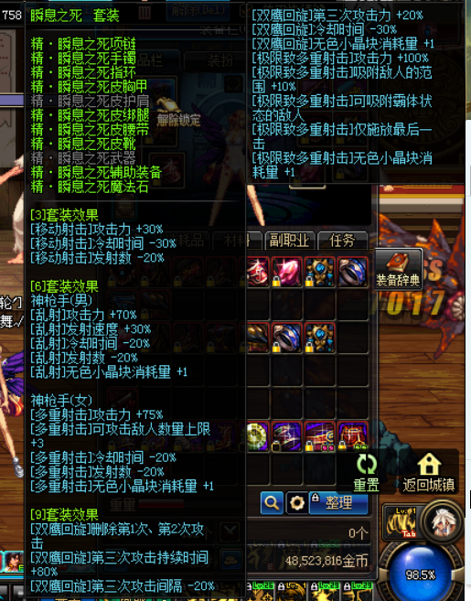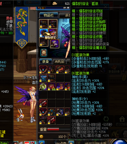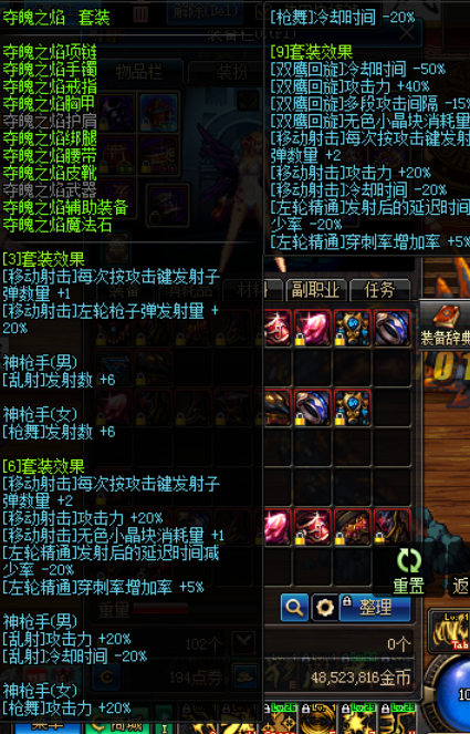 这套的主要特点在于,对多爆/枪舞/鹰枪的减CD是固定的,而这点,可以延伸发展的情况就如前文致命9减CD情况类似,配合魔战/春花/CD药水,收益 1+1远远大于2的效果,配合魔战衣春花称号CD药水,几乎就可以无脑丢技能。但是局限点在于伤害的提升非常小:多爆只+范围,枪舞才30%攻击,双鹰仅 仅是25%。死左10%在困兽6/绿气死左散件面前是个笑话。而引以为傲的减CD,在剖析【致命一踢】9后,我们发现致命9在某种程度上完全可以取代爆裂 9,而致命套对所有射术主力技能都有加成,爆裂套却仅仅是加成3个。我不想如此残忍的一棍子打死爆裂套,因为我的男漫也有一套红字增幅爆裂9,但是事实是 这套的地位确实很尴尬。当然也不是一无是处,比如说有的朋友比较懒,不想死左换装,又有魔战衣春花称号很舍得吃CD药水,使用这套就可以几乎无限丢技能。 从某种程度上而言,一定条件下,这套真的是适合懒人的"最安逸的"一套"。