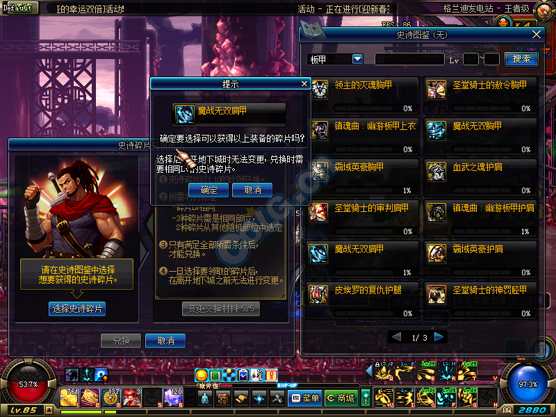 也就是说,你要换魔战肩的碎片,你需要三种85级的肩的碎片+两种85级随机部位的碎片才可以换一个肩的碎片。