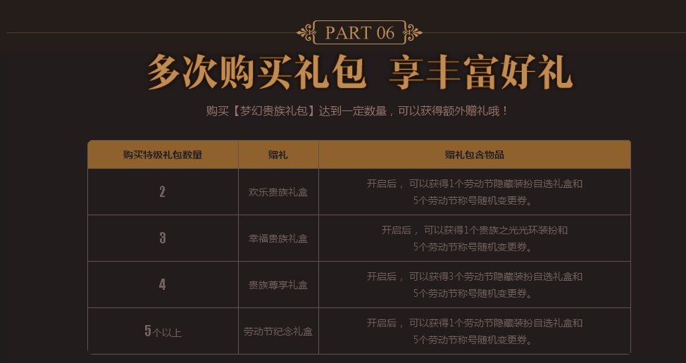 B:重复购买多个【梦幻贵族礼包】时,会获得【劳动节隐藏装扮自选礼盒】,打开后可以选择1件指定职业和指定部位的隐藏装扮。