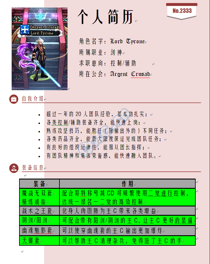自从韩服传出将要削弱魔战肩的消息后,随即大批玩家表示打团不要白手,剑魂就这样遭到了安徒恩20人团的无情抛弃。这个白手玩家制作了一份全新的“求职简历”,希望砍肩之后也能顺利求团~这简历你别说做得还不错。给个赞!