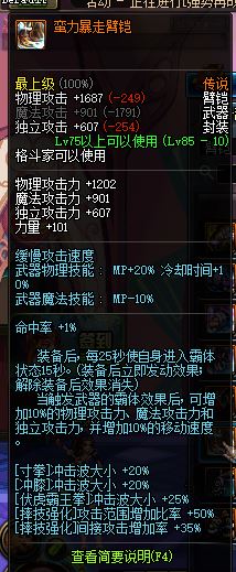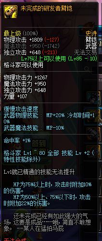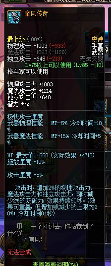 现在我基柔还在用的武器,感觉也不错,有奶的情况下不输未完成。但是拳风由于是手套,本身基础物攻就比臂铠少了260左右。哪 怕叠满了拳风的BUFF,达到1600物攻,实际减去本身和臂铠的差别部分,也就只有30左右物攻的优势了。好在还加了不少独立,虽然基柔大多数还是百分 比。所以把它排在第五了。