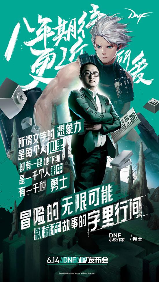 本次DNF IP发布会中,作为DNF官方小说作家的卷土将登上舞台,带来他初步构建的阿拉德世界,用文字描绘每个DNF玩家心中的冒险天地。藏在他字里行间的豪情, 是否能够尽展勇士们的无畏风采;用文字描述,是否能够写尽那些感动人心的精彩故事;用文笔描摹,是否能够勾勒阿拉德的宏大背景以及深刻内涵?