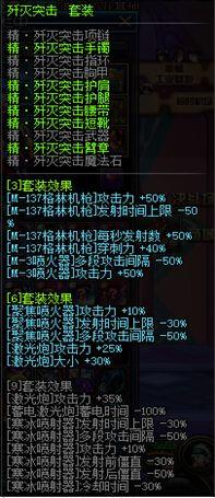 精•歼灭突击者6件套,俗称歼灭6,异界2,成型相对较快,主加技能为细火,粗火,格林机关枪。现在女大枪的主流配装之一。