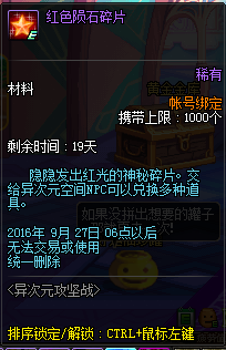 在活动期间,Lv17以上的玩家可以通过赛丽亚房间的NPC异次元空间进入地下城,每个账号每日一次。玩家需要在3分钟内破坏 蕴含神秘能量的巨石,根据破坏的阶段掉落奖励。需要注意的就是每个账号每天只能挑战一次,而且获得的红色陨石碎片是账号绑定的,所以尽量用大号去参加,可 以节省很多时间。