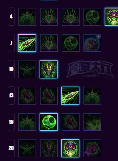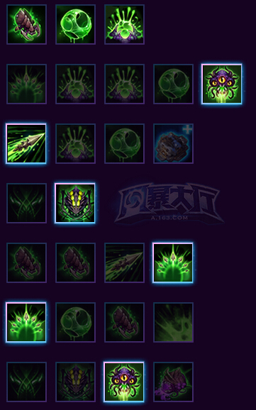 第一层天赋选择强化w范围,接下来是腺体过载加攻速,这是核心天赋,尖刺之脊,大萌虫,13,16级都选择强化w,20级双共生