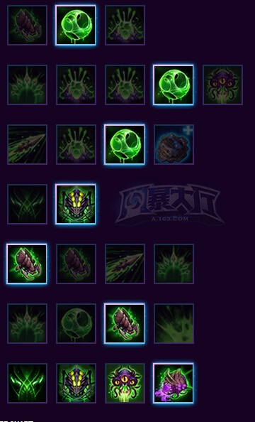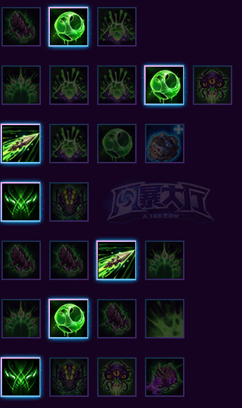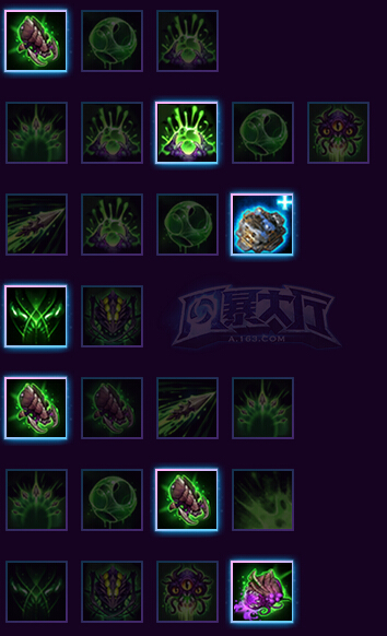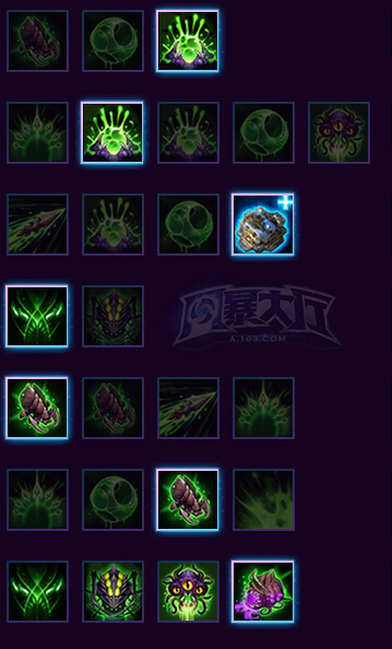 中规中矩的蝗虫强化路线,4级点出真菌投掷是因为可以点推线流的地图都不小而且大多需要视野,譬如诅咒谷黑心湾,点上无限视野的雷就可以做到“管你推到哪路,我就是能随便放地雷不服进来杀我呀孙贼!”(最喜欢这句,合辙押韵)