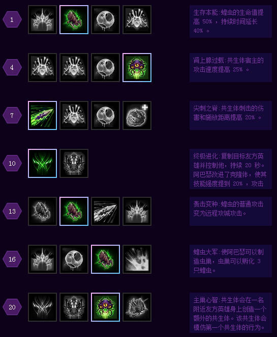 为什么我不推荐点R2?分析:R2虽然看起来是个强大的带线技能,实际上在中高端局中,对手会非常针对你的虫子。虫子在小地图上暴露视野时,有一个很大的图标,对手会警觉地先处理掉你的虫子,这样你的大招白白浪费了。并且一旦对面发现你在疯狂带线,势必会观察其他两路的情况,导致你的被动虫子也被清理掉。所以放R2要掐好时机,在刷地图机制的时候放出来,而且注意一个细节,尽量选择中间掉球的小兵进化虫子。虫子虽然带线强大,但在没有你附身的情况下,不会强过一个F4。一旦你附身虫子,将会浪费大量支援队友的机会,轻则被喷,重则团灭。R1应该是大多数情况下的选择,首先作为玩家,复制一个高爆发的英雄,看着短时间内对面血线被压下,成就感是非常强的,另外R1一定程度上能浪费别人的技能,并且你死后,依然可以通过附身加入战斗。阿巴瑟在没有20级点双附身的情况下,团战时依然比不上一个真正加入战场的英雄。