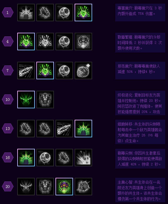 因此我推荐这套天赋,这套天赋是我个人认为这个版本的万金油,在很多很多时候这套天赋都是稳稳的幸福。下面是我的分析:284的q虽然看起来很方便切换,但是实际上cd是比较长的,在遭遇战中很难切换到适当的位置,这就非常考验玩家的大局观。大家一定要沉得住气,当你的队友气愤地问你,为什么不附身我。这时候你一定要跟他硬刚不一般见识。284的这套天赋在保持虫子强大的带线能力同时又具有很强的俯身打团能力,10级的复制虽然看起来还是5打5。但是突然战场冒出来一个人会让对面措手不及,因为从开局就习惯性的四打五,突然的转变会让对面开始慌了。打团打个平分秋色,回头一看堡垒炸了,这种心理压力是非常大的。击败你的敌人,一定要从心理上打败他们。但是同样这套天赋也有缺点,一直要到7级以后,收益才会明显体现,所以一旦队友在7级之前就被拉了超过一级的经验。