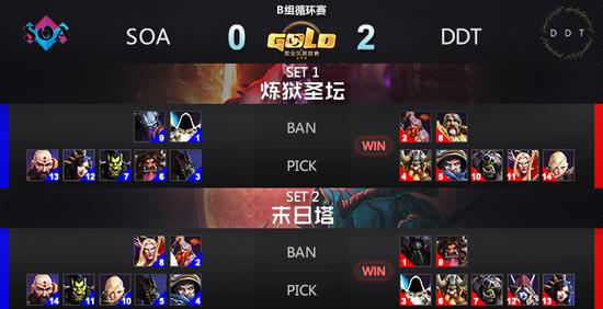 SOA再一次选择了末日塔作为自己的败者图,奇怪的是他们并没有使用任何特别的阵容套路。比赛过程中双方平稳过渡到10级,SOA在中期开始发力,数次抓住对方阵型脱节的破绽,抢在先祖治疗生效前秒杀泰瑞尔,逼退DDT,并且一度在核心血量上获得了接近10点的优势。然而在泰瑞尔变得更为谨慎后,上路祭坛开启前的交战SOA想要对穆拉丁如法炮制,却遭到团灭,付出了三个祭坛以及一个首领的巨大代价,DDT核心血量反超。而泰瑞尔到达16级拥有神圣之地的天赋后,变得更难击杀。无法抓到对手破绽的SOA又陷入了团战不胜的怪圈,并且在之后连削减对手核心一点生命值都无法做到,遗憾的以0:2的比分告败。