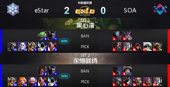 首局比赛在黑心湾进行,SOA选出了扎加拉、加兹鲁维、莫拉莉丝中尉的推进体系,而eStar的抱团推进则成功的打乱了他们的计划。SOA在经历两次“空难”后勉强换掉eStar下路要塞,随后就遭到了eStar的反扑,在欢声笑语中打出了GG。