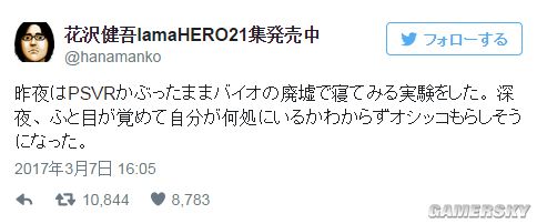 几日前,花泽健吾发推声称自己在前一天的晚上做了一个实验,头戴着PSVR就在《生化危机7》里的废墟中睡觉了,半夜的时候突然醒了过来,一睁眼迷迷糊糊的不知道自己在哪里,差点就被吓尿了。