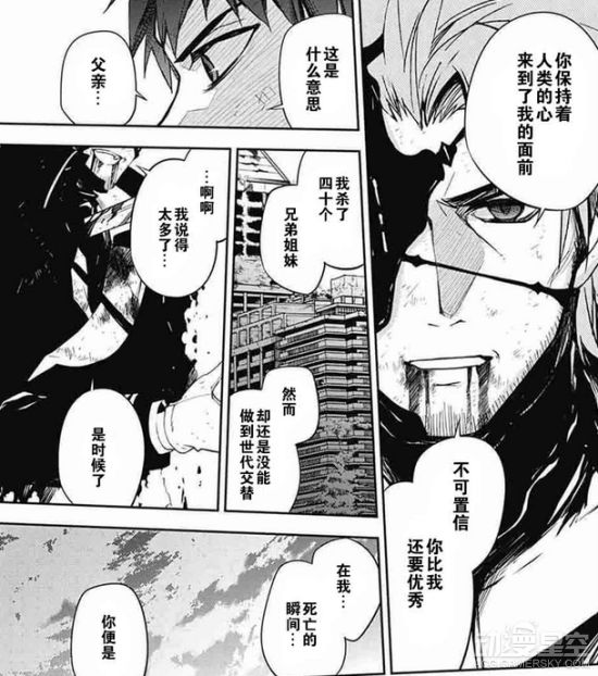 凭借着“终结的炽天使”的强大力量,被父亲斩断一只手的暮人在困境中绝地反杀,这次他终于完成了杀死父亲的愿望。原本打算从天利的口中问出些情报,没想到父亲的一席话反而让暮人越来越迷惑。
