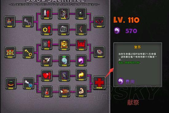第三排最终技能是“复苏”:当生命值过低的时候会恢复2%的生命值,该效果每个有效场景只可触发一次,持续时间10秒。