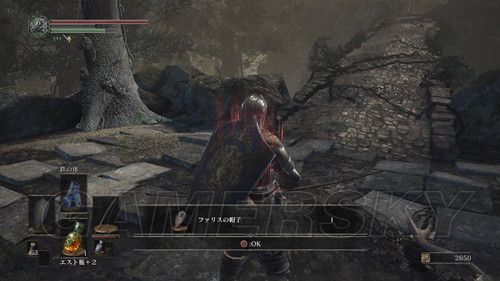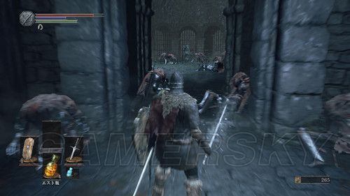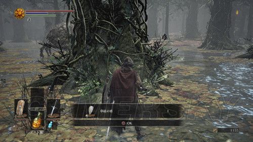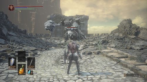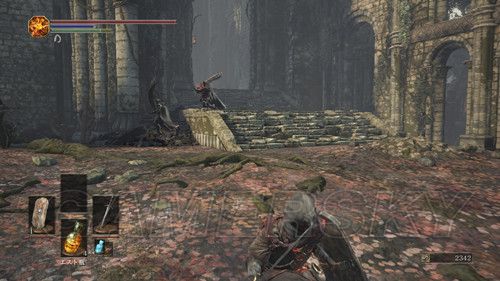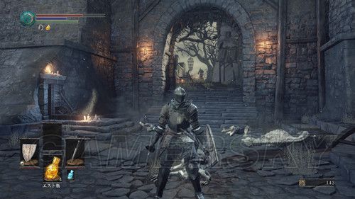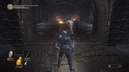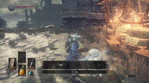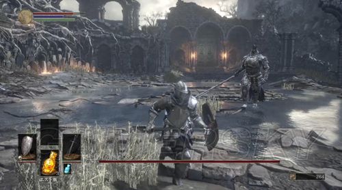 第一个营火左右各一条路,严格意义上说,左右两条路是互通的,右侧除了两个杂兵外,没有可收集的东西,右侧小路,玩家会遇到手持长矛和木盾的杂兵,这里应付杂兵的关键点在于,抢在杂兵出手前出售,猥琐一点的可以勾引杂兵先攻击,然后伺机而动,尽头可以捡到5个火炎壶,消耗道具,蹲营火不会补充,原路返回,准备进入遗迹,迎接第一场BOSS战;