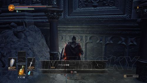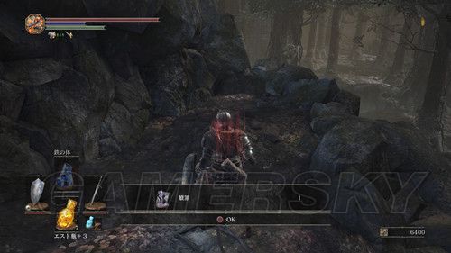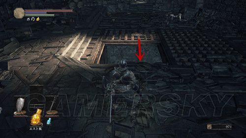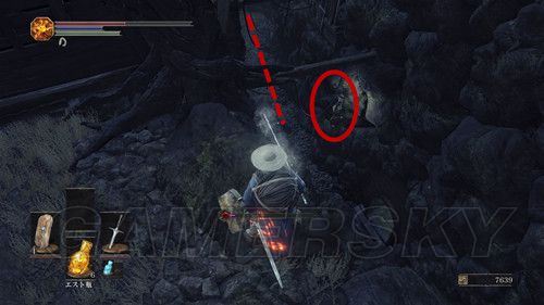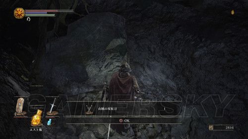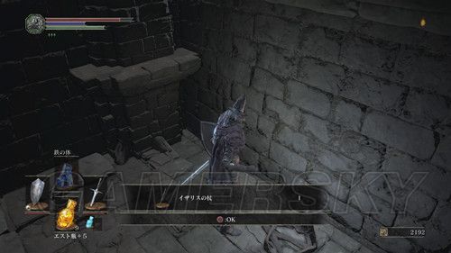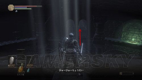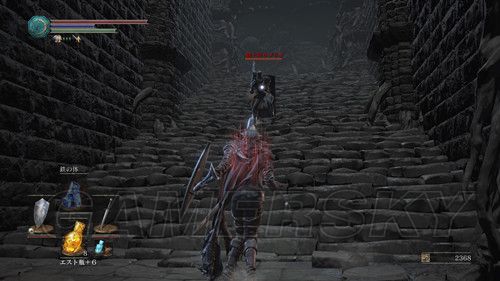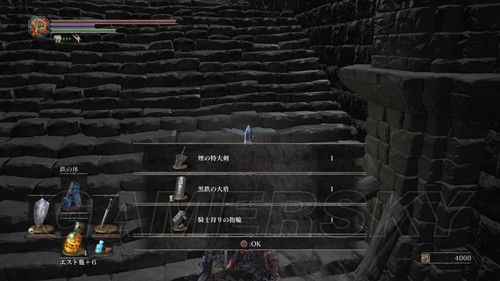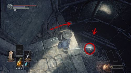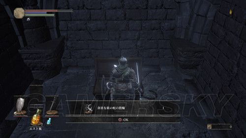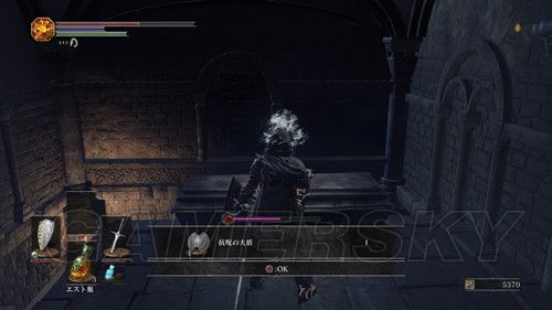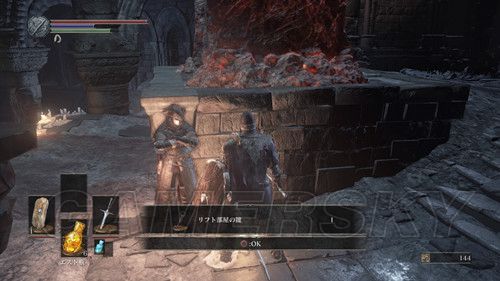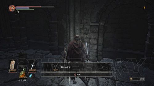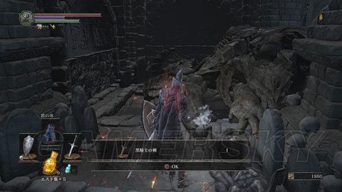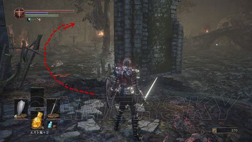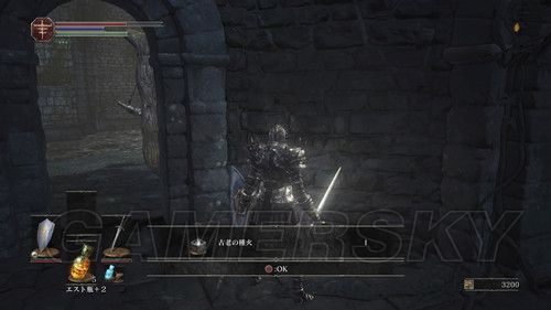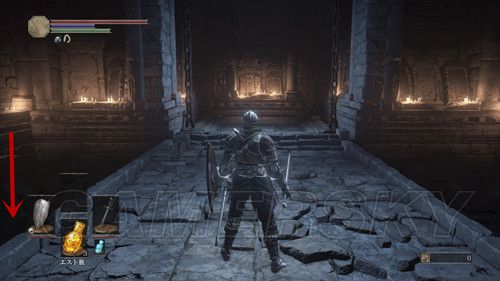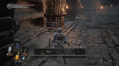 我们从BOSS前的遗迹一直走,走到有好多火球的房间,一直朝右走,右边通道的尽头是幻璧,打破它,可以拿到黒騎士の剣,一直向前走,可以到达篝火;