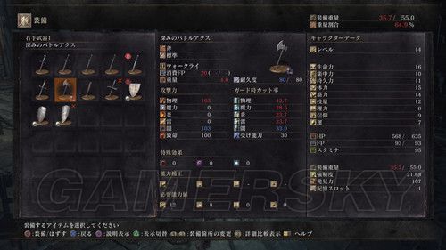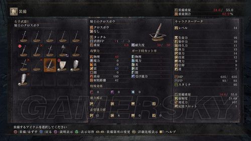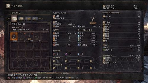 左上角红条为体力槽、蓝条为战技槽、黄条为耐力槽,左下角为武器装备栏、右下角是玩家所持的魂;