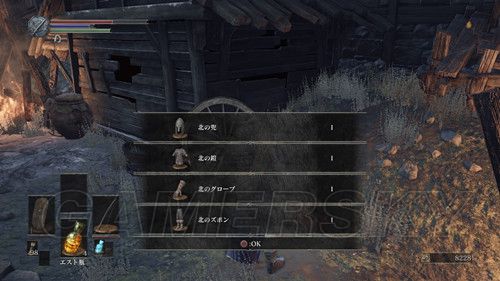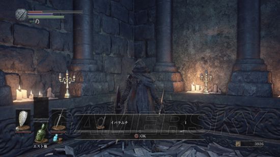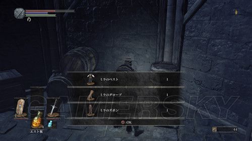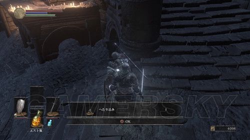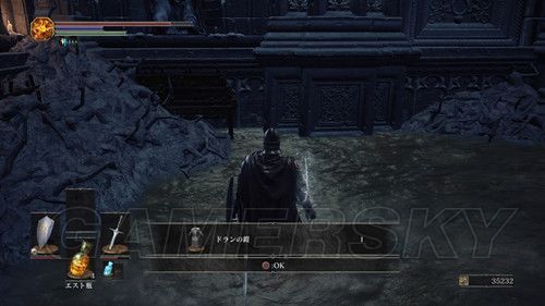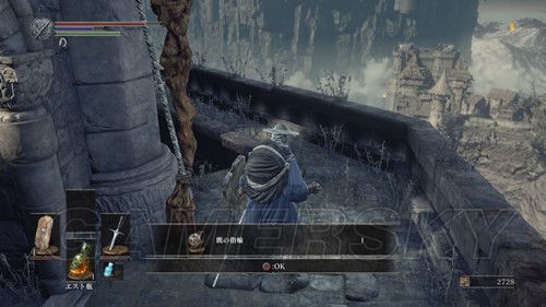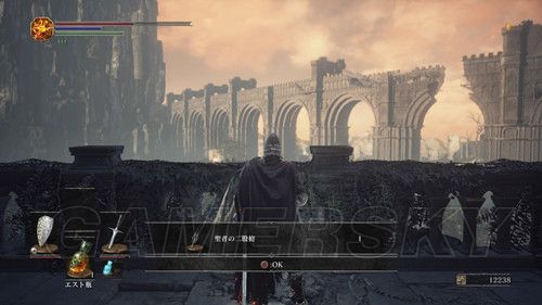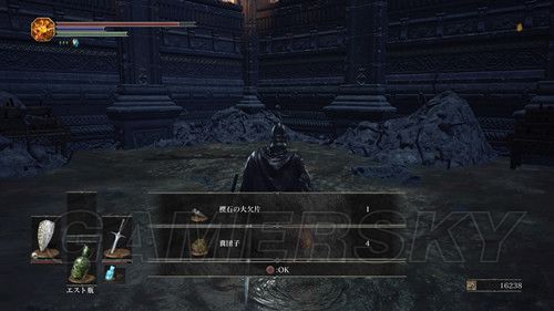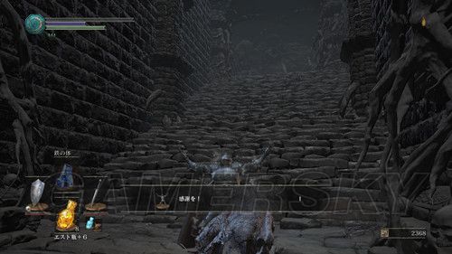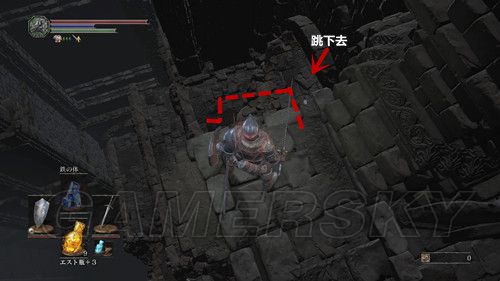 当我们返回塔顶,前往另一座塔时,不要着急坐电梯,在电梯左侧,跳下去(左摇杆+X→L3是跳跃),可以拾取“火防女のローブ、火防女の腕帯、火防女のスカート”火防女女三件套,魔抗看上去还不错,然后再往下跳,可以拿到“エストの指輪”,然后我们在乘坐电梯前往塔顶,在塔顶可以拿到“穢れた火防女の魂”拿到这个魂之后,我们可以返回火防女处交给火防女,然后可以前往锻造屋强化体力瓶使用次数;