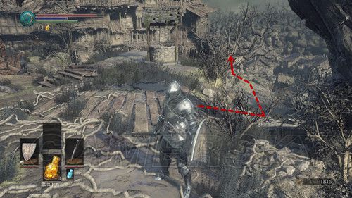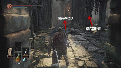 从营火前进,我们可以看到一大片沼泽,但是不要从水里走,我们先从右侧,贴墙走,一直走到头,可以进入一个建筑物,进入建筑后,右侧有个楼梯,上去后可以拿到佣兵四件套,回到走廊,期房不远处的尸体上可以拿到傭兵の双刀,然后我们返回第二个营火;