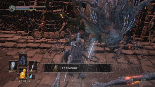 篝火所在房间的左角有一处幻璧,打破之后,可以在里面拿到エストのかけら(强化原素瓶),在篝火正对的通道尽头可以拿到イザリスの呪術書,然后返回BOSS前的篝火,击杀BOSS前巨大的蠕虫可以拿到雷の杭和不死の遺骨,之后先返回篝火;