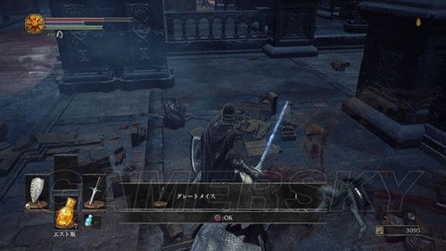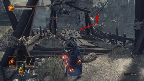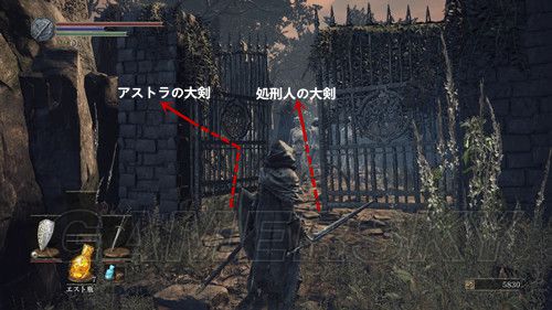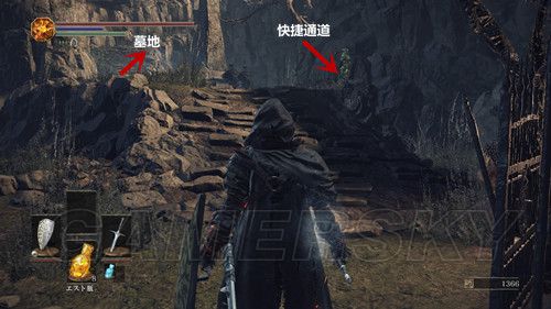 出教堂,在台阶上几个拜石碑的敌人前面可以捡到エストのかけら(强化血瓶使用次数),进入墓地后,进门的左侧可以拿到アストラの大剣,然后墓地最深处(靠左哪条路)可以拿到処刑人の大剣,由于杂兵太多,建议慢慢来,拿到武器后,走左侧的石桥,这个场景,建议多顶着盾牌;