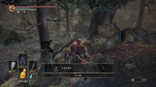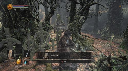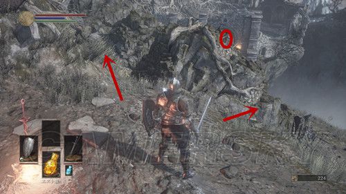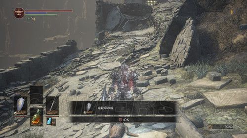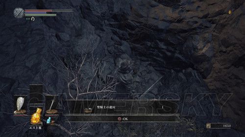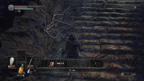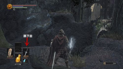 我们先走左边,在桥正中央,看到左侧下方有个台子,跳下去,可以在前面的尸体捡到カーサスの呪術書,一直向前,看到一处通过右侧的道路,相对的悬崖边可以捡到鋭利な貴石,然后上阶梯,此时利用骨片回到篝火处(继续探索是可以的,但是没什么值得拿的东西);