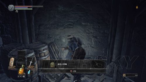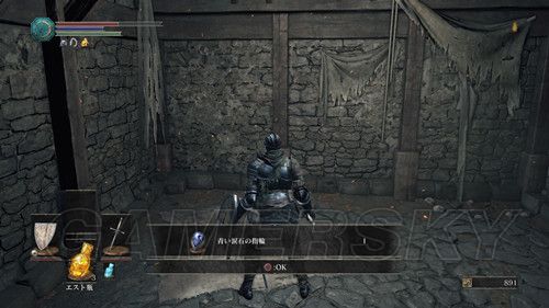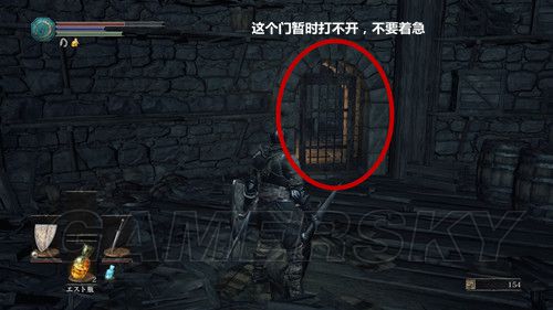BOSS战结束后,没有进行收集的玩家不要着急前往下一个区域,我们传送回“高壁の塔”的营火处,进入收集模式,从台阶下去后,我们从房顶右侧第一个木梯下去后,梯子左侧的门,进入最深处,可以捡到牢の鍵,捡到钥匙后,我们返回高壁の塔,然后前往该建筑的最下层,不熟练的情况下,建议清完兵,一步步向前推进(不开心的话,可以从左侧,连续跳下,到最下层之后,直接玩跑酷,到最深处),到达最深处的牢房后,用钥匙开启地牢的门,与牢里的NPC对话,选择听他说话,然后获得青い涙石の指輪,NPC消失;