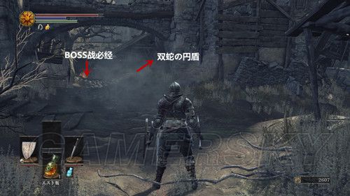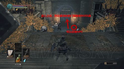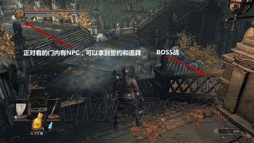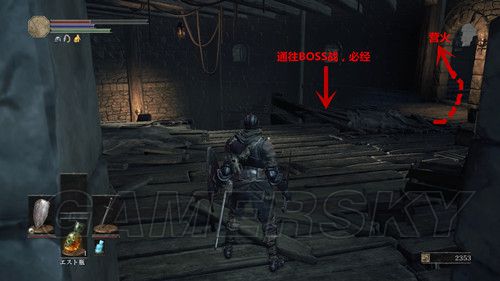 第三个营火面前的建筑,左侧的墙面有个破洞,我们进去之后,一直向前,当我们上了坡道,进入面前的门,就是一场BOSS战;