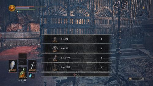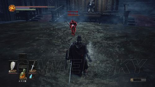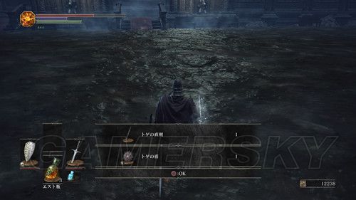 推开营火前的大门,清理掉路上的杂兵后,可以看到一个门,可以前往新场景“火継@ぎの祭祀場”,门的左右个一条路,左侧尽头可以拿到传送骨片和增加角色HP上限的道具,右侧台阶尽头是一个人形精英,攻击欲望出奇的高,靠近后会主动攻击,攻击频率高,连段很可能一套被连死,被攻击后100%中毒,每次攻击会加快毒发速度,但是被玩家攻击后,每次攻击都能打出硬直,要利用这一点,好在本作死亡后不会变成人干,血条上限也不会减,多尝试几次即可,击杀后掉落打刀、达人的胸带、达人的服,但是后面门无法打开;