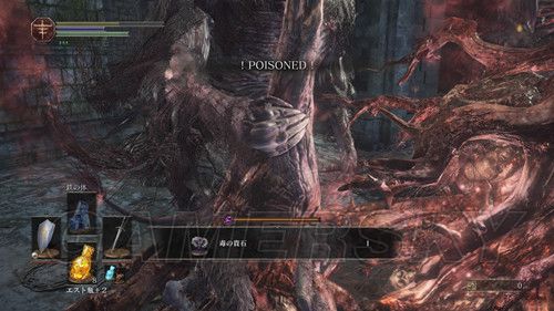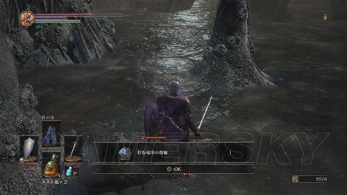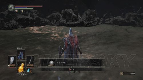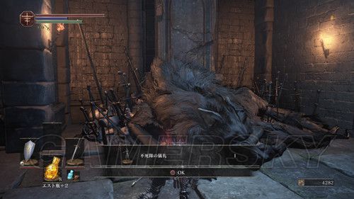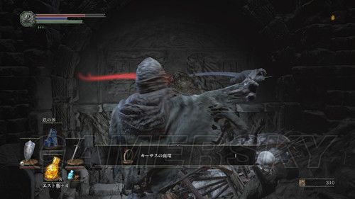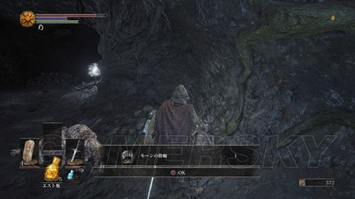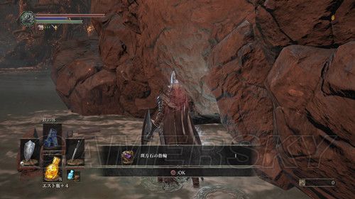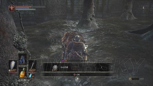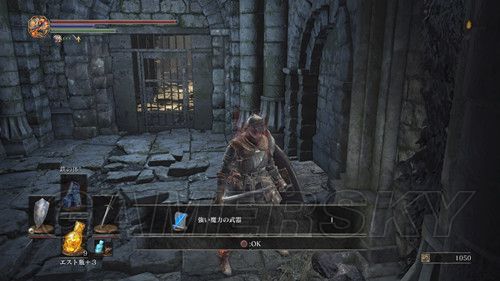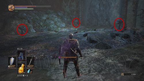 从右侧贴墙走,会看到一个通道,走到底,有名NPC,击杀之后可以拿到リンドの盾,在这里需要注意,会有个机关将矛从高处丢下,之前遇到过,但是不同的是,这次每次会连续丢出两根矛,而且命中率极高,这里不要着急想要解决这个麻烦,在巨大蟹的附近可以拿到混沌の貴石和渇望の盾;