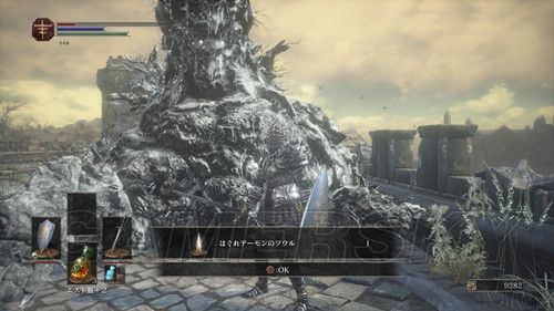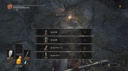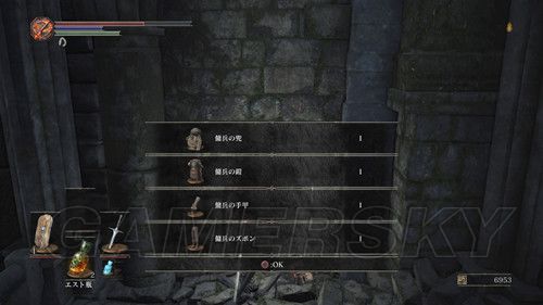 到达顶层后,我们可以在该建筑的最顶层可以看到白色的はぐれデーモン,击杀后,我们可以拿到はぐれデーモンのソウル,我们转身,从右侧的缺口往下跳,从前面的路上去之后,可以看到龙的尸体,在他的附近可以捡到竜紋章の盾、雷の槍,然后返回老狼胖的营火,从木梯下去,在木梯正前方的墙角里,可以拿到无名骑士四件套;