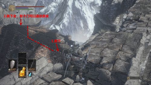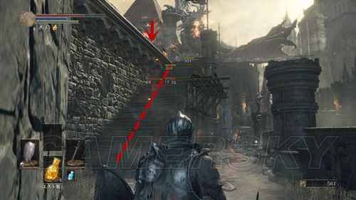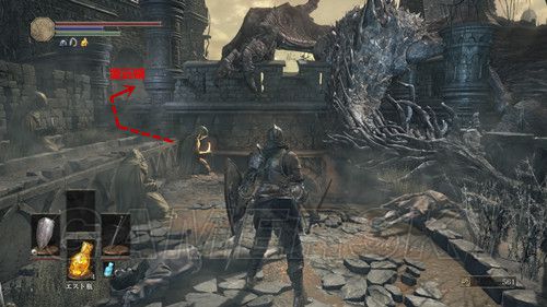 到达新场景后,打开面前的门,在台阶下就是该场景第一个营火,游戏中第四个营火,点燃后,我们从左侧的台阶下去,径直的走,看到第一具飞龙的尸体之后,我们不要着急下去,从左侧的台阶上去,可以拿到遠眼鏡,然后原路返回,从飞龙尸体下的门进去,直接通过木梯前往下一层,直走出门后,发现左侧有台阶可以上去,右侧也有一条路,但是有两个火箭兵和杂兵若干,玩家最后会发现,两条路是互通的,这里我们选择从左侧台阶上去,看到一头喷火的龙,玩家被火灼伤后,会持续性掉血,飞龙吐完火后,玩家碰到地面上残存的火苗还是会受到伤害,不过此时受到的伤害在可接受范围内,因为进门之后可以到达本场景的第二个营火,地上的物品无必须收集的物品,想要收集的玩家,可以等开门进入建筑物内后,伺机去拣;