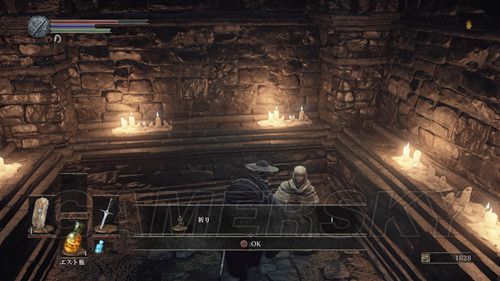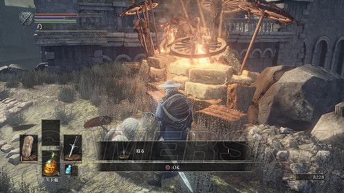 终于见到黑魂经典NPC火防女,不过似乎眼睛完全被头饰遮住了,下面是第三个营火,将螺旋之剑插入,可以在各个营火间传送(如果下载版,没有完全下载游戏,是无法来回传送的),这个场景还有祭祀场的侍女,可以买卖道具,可以制作/修复/变质/武器,与系列以往不同的是,这次强化血瓶是在锻造屋的这个NPC处进行;