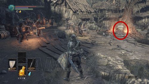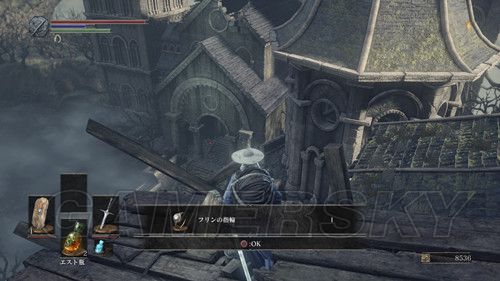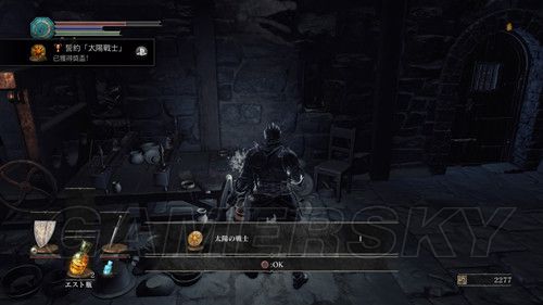 从营火处往下走,先不要着急开门,道路左侧的马车旁,可以捡到誘い頭蓋,然后再去看门,进门后,对面的破屋子里,有营火,进去点燃,点燃后,我们朝着左侧的房间前进,在二层走廊,有悬挂的尸体,看一下,让尸体上的物品掉落,然后可以选择直接跳下去,也可以进屋走楼梯下去,拾取后获得ロレッタの骨,这个之后可以交换道具,暂时不会用到,然后广场中间的圣职者(超级死胖子),给了很多背刺的机会,来开空档,好好利用,然后我们从左侧道路,选择桥左侧的道路,进到屋子里后,前进一段,地上有个缺口,跳下去,然后转身,走到尽头有个楼梯可以上去,左侧门打不开,我们从楼梯上去,在房子的角落里,地上有个洞,跳下去可以拿到誓约【太阳战士】,拾取旋即解锁誓约“太阳的战士”奖杯,铜杯;