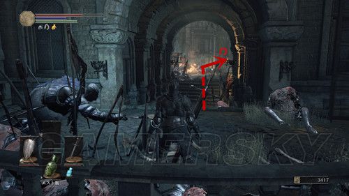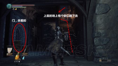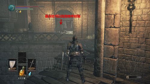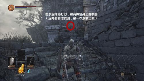 返回拿到誓约青教那个建筑的左侧台阶上,有一个蓝衣红眼骑士,击杀他后可以拿到骑士长剑、骑士弩(PS:这个场景一共可以拿到3块儿楔石の欠片),然后我们可以安心前往不死街;