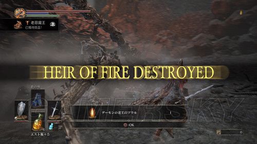 BOSS战没有找到行之有效的办法,就是利用地形,找机会输入,BOSS要是把武器两头相对较大的一头举上天,应该就是要召唤火流星,这个时候上去差不多能输入2-3刀或者更多,保险起见,不要贪刀,慢慢磨掉BOSS的血即可,击杀BOSS后,获得デーモンの老王のソウル,解锁奖杯,老恶魔王,铜杯,这里不要着急前往下一个场所,这里还有一些必须要收集的物品;