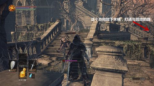 从墓地通过,我们看到巨大的建筑,右侧台阶的建筑里,可以捡到抗呪の大盾,下去之后可以放下木梯,开启与营火的快捷通道;