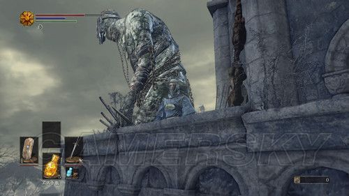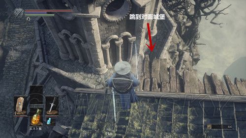 我们再次来到地下墓穴前的建筑,门口有个拿着大锤子且坐着的骑士,我们进入建筑之后,先前往最上层,会看到刚才丢矛的真凶,巨人,第一次对话,我们选择友好を示す,NPC会给我们一个幼い白枝,然后直接砍了它,击杀之后可以获得鷹の指輪,然后我们做升降梯下去,上升降梯后,立刻转身,当升降梯经过第一个窗户之后,过1-2秒翻滚跳下去,这里是个隐藏区域,你会看到一个穿的像个宇航员的骑士,坐在地上,远处有只拿着斧子的敌人,下去触发战斗,骑士很帮忙,击杀这个杂兵后,会掉落炎の貴石,然后再与骑士对话,第一次获得ジークの酒,接下来两次对话会分别习得两个新动作举杯和乾杯,这里千万不要着急回去,这里场景不大,可以拿到在屋顶拿到フリンの指輪,ラージクラブ,北方四件套,而我们需要从屋顶跳到另一座城堡里,在城堡最下方,可以拿到未来三件套以及緑化の指輪,下面是前往这个隐藏区域的视频演示,视频中没了NPC和收集,因为是从区域另开后录的;