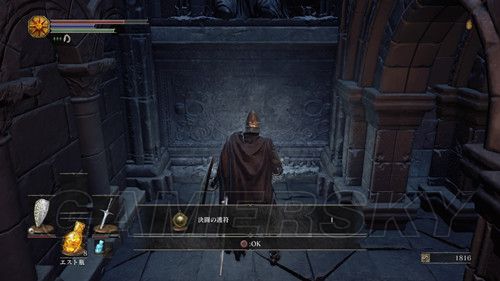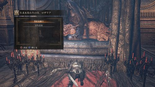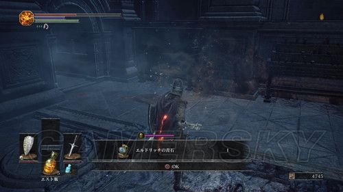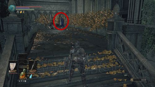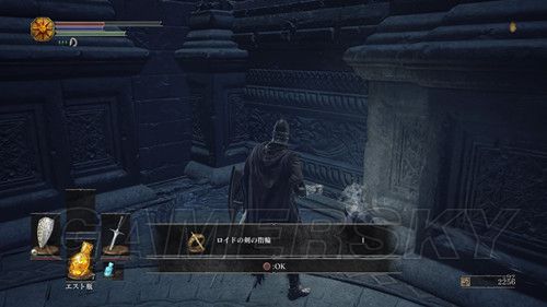 然后我们前往通往BOSS战的哪条路,朝前往BOSS战相反的方向走,尽头的建筑物内,与最深处的NPC对话,第一次可以获得ロスリックの小環旗,第二次对话可以获得誓约【青教】,并且解锁奖杯誓約"青教",铜杯;