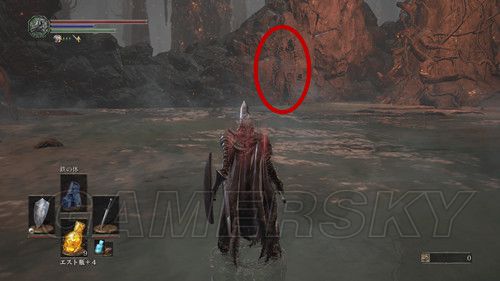 我们同样到达熔岩地带前的场景,我们走向上的台阶右侧有一名NPC,击杀后可以拿到煙の特大剣、黒鉄の大盾、騎士狩りの指輪(被他击杀后能拿到新动作感谢,被嘲讽了啊),然后熔岩地带的深处可以拿到可以拿到猛毒の霧、白髪のタリスマン、竜騎兵の弓,但是这里一定要准备炎耐性高,然后去学习咒术激しい発汗,配合血瓶,可能需要反复几次才能拿到;