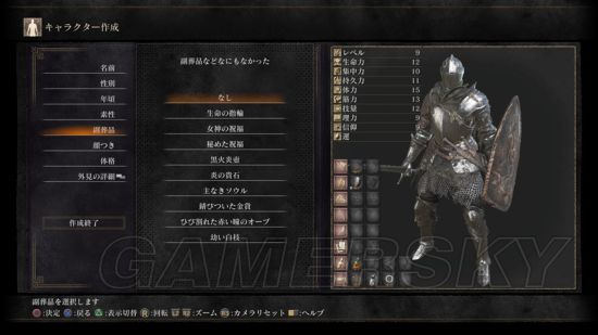 玩家创建角色时,可选择的出身(职业)一共有十种,分别是骑士、佣兵、战士、传令、盗人、刺客、魔术师、咒术师、圣职者、一无是处的人(参考血源),而可以选择陪葬品分别是生命戒指、女神祝福、隐秘祝福、黑火炎壶、炎之贵石、无主之魂、生锈的金币、龟裂的红色宝珠以及幼嫩白枝;