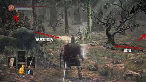 进入游戏后,第一个分岔口左转,走到底,可以拾取一个灵魂,然后,原路返回,径直朝前走,可以拾取一个灵魂,途中会遇到三个敌人,注意躲避,战斗不难,一路向前,悬崖旁坡道的尽头是游戏中第一个营火,选择点燃营火,和系列以往的作品一样,可以回满血瓶使用次数,同时战技槽和体力槽回复最大值,同时第一次点燃篝火可以习得“休息”的动作(并且跳“点燃营火”的奖杯,铜杯);