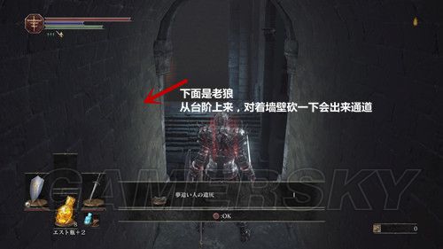 从营火向前走,我们会看到巨大的石门,因为我们还没有熄灭火,所以这个门暂时不会打开,我们先去左侧的建筑,从木梯爬上去之后,可以和房子里的老狼签订契约,可以学会新动作不死隊の儀礼,选择誓約を願う,可以获得契约ファランの番人,并且解锁奖杯誓约“法兰守卫”,铜杯,我们先从出门,从左侧的梯子上去,第一节台阶过去之后,我们肯以看到拐角处有个类似门的形状,砍一刀,进去可以捡到夢追い人の遺灰,然后我们从老狼右后方的升降梯前往顶层;