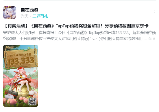 除了常规的预约奖励外,《自在西游》在TapTap和好游快爆两个游戏社区也开启了有奖预约活动。在这些渠道预约的玩家,除了能领到官方的里程碑奖励外,还有机会参与京东卡瓜分、限时抽奖等活动哦: