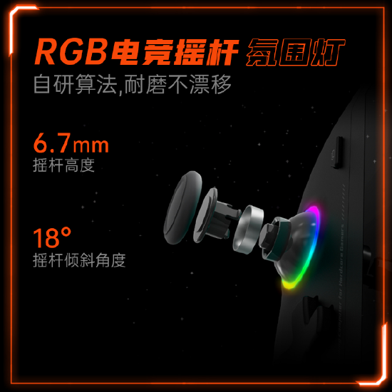 此外,这款机器在两侧手柄底部采用了可拆卸式外壳,预留RGB铭牌卡位,用户可根据需求定制个性化RGB铭牌,配合RGB摇杆灯,电竞氛围十足。
